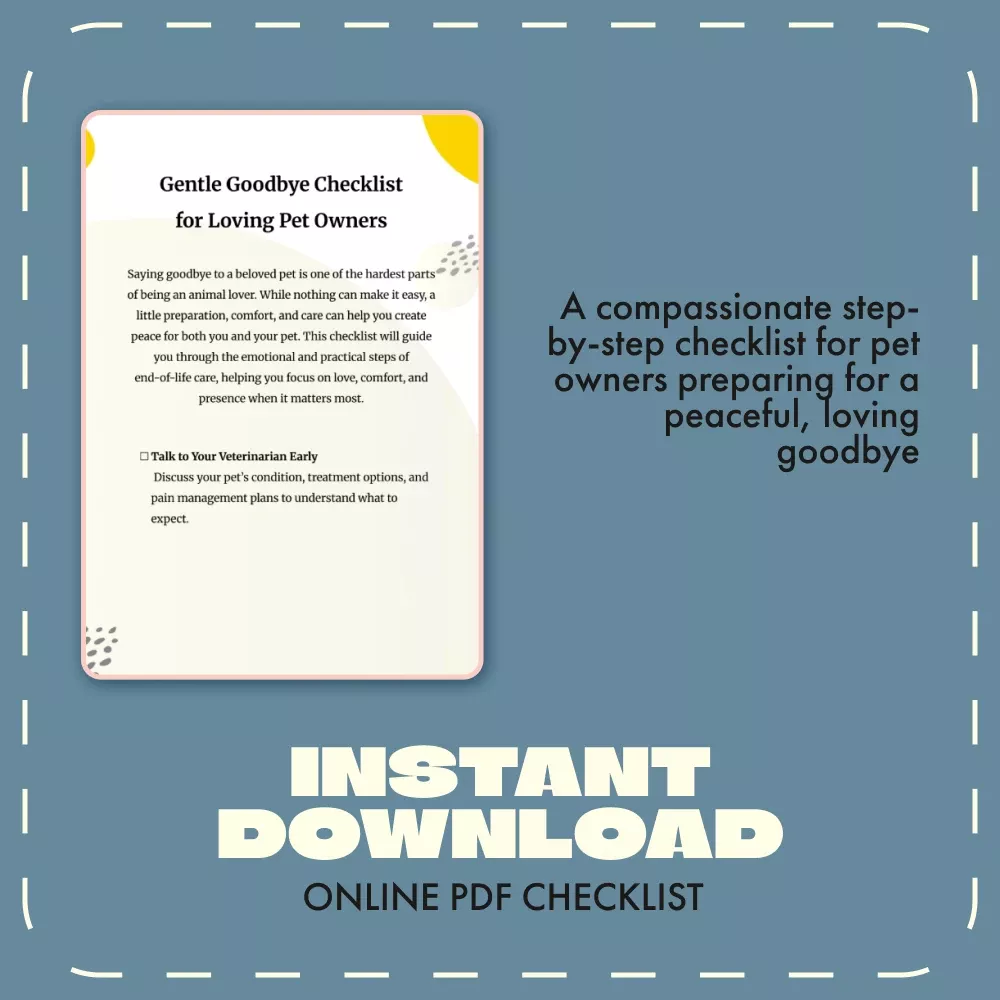 Saying goodbye to your beloved pet is one of life’s most heart-wrenching moments. The Gentle Goodbye Checklist for Loving Pet Owners is a thoughtful, compassionate digital guide designed to help you navigate this emotional time with love, dignity, and peace. Whether your furry friend is nearing the end of their journey or you’re preparing ahead, this printable pet loss checklist provides clear, gentle guidance for every step — from talking with your veterinarian to creating a peaceful environment and honoring your pet’s memory afterward.